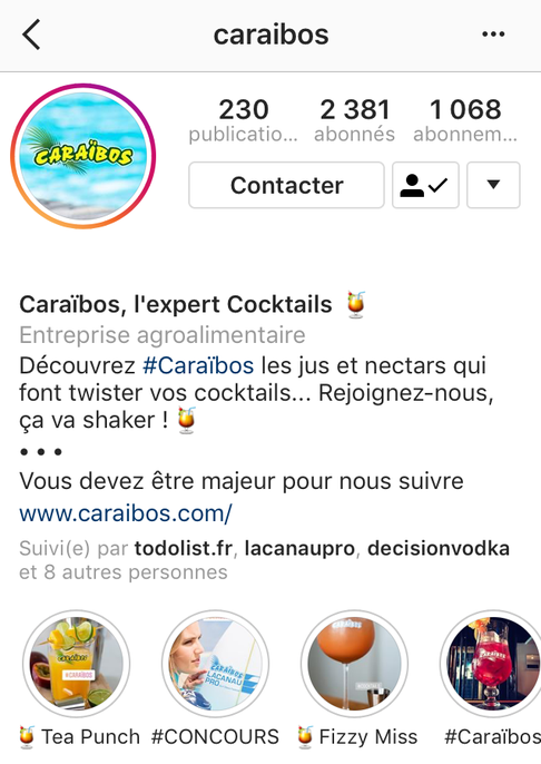 Voici par exemple comment nous utilisons les stories à la une pour les jus de fruit à cocktails Caraïbos :